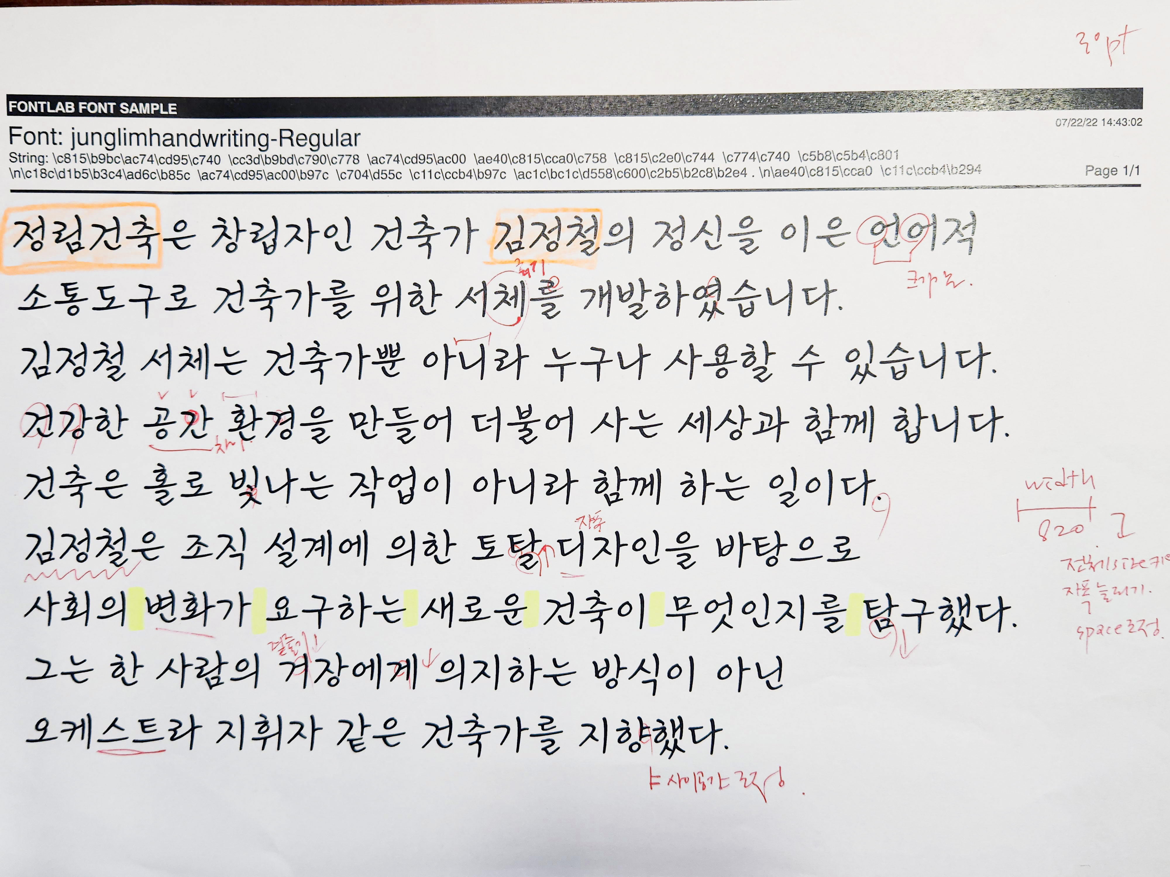2022년 6월 [김정철 명조]와 [김정철 고딕], 12월 [김정철 손글씨]로 비로소 짓기를 완공한 [정림건축 김정철 서체] 프로젝트. 건축계 안팎의 모든 사용자들이 이 글자를 쓰면서 저마다 자기 마음의 도면을 그리고, 이 글자 안에 내재된 튼실한 ‘자재’와 더불어 소중한 삶의 기록, 무엇보다 자기만의 올곧은 ‘상’을 지어 가기를 바랍니다.