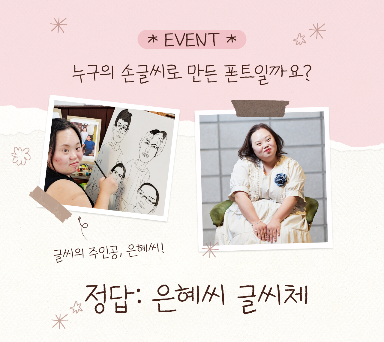 손글씨 폰트 「은혜씨 글씨체」 출시 기념으로 진행한 <ㅇㅎ씨 글씨체> 퀴즈 이벤트에 참여해주신 여러분, 고맙습니다! 여러분의 관심과 응원으로 그냥 봐도 예쁜데, 쓰면 더 아름다운 「은혜씨 글씨체」가 은혜씨의 따스한 미소처럼 세상에 번져나가기를 바랍니다.