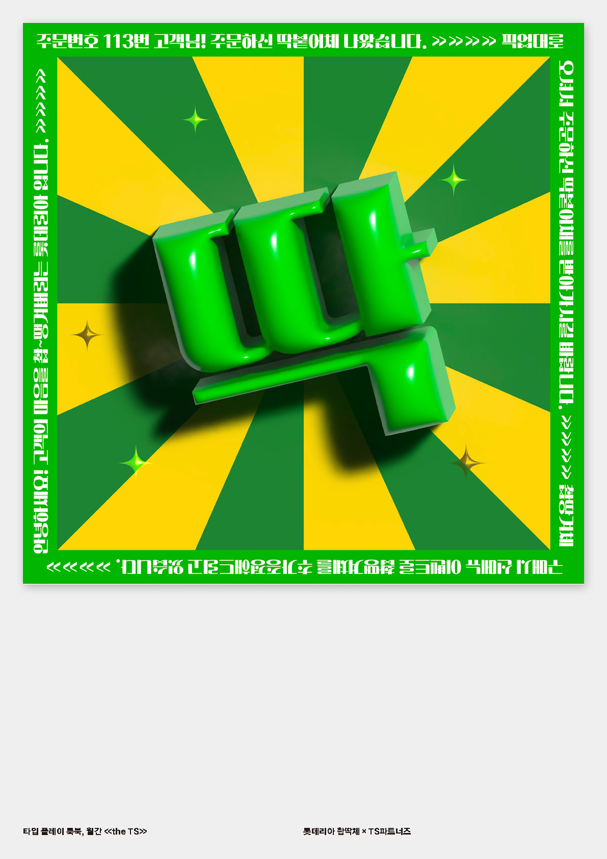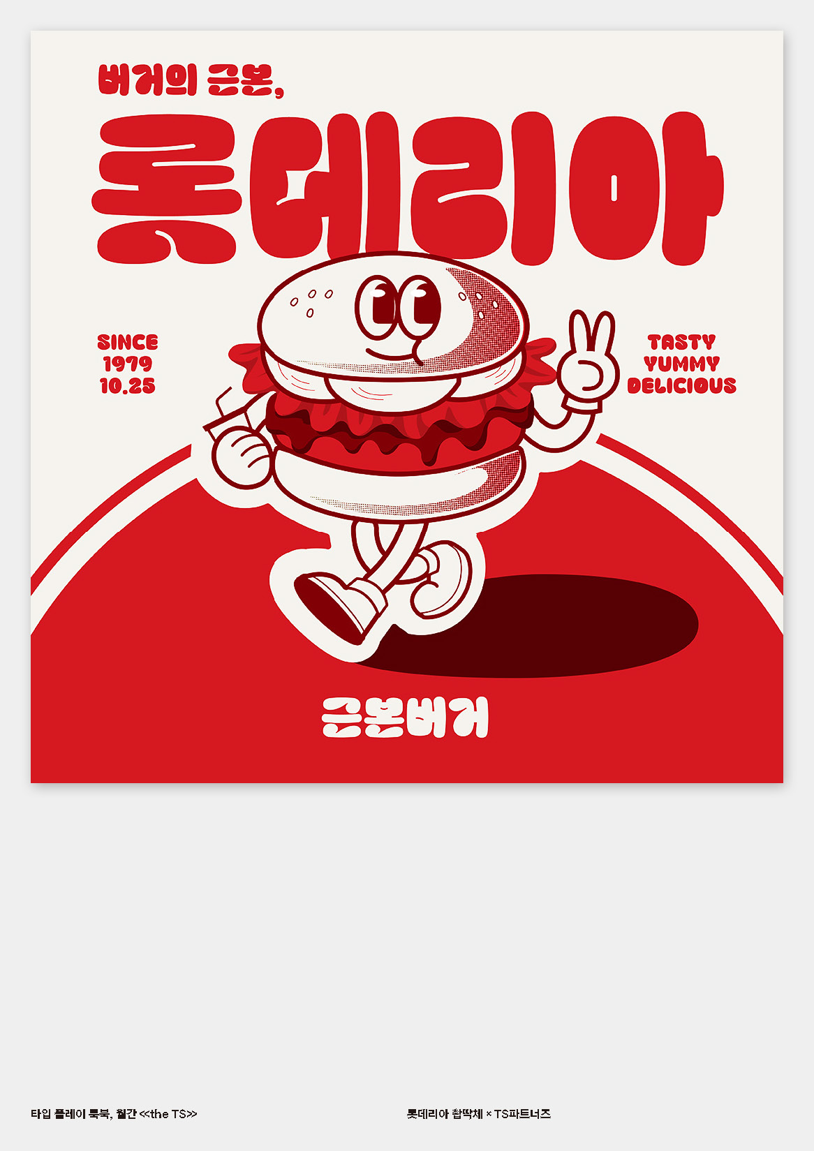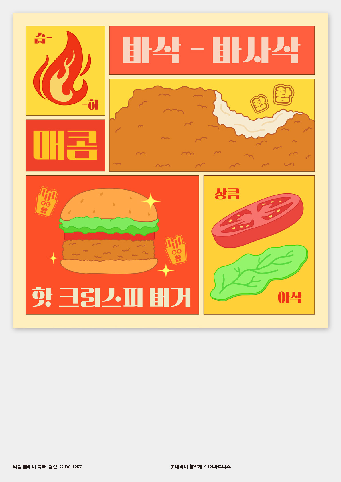월간 《the TS》 2023년 3월호는 「촵딱체」 2종을 활용한 타이포그래피 작업물 모음입니다. 서체를 개발한 엉뚱상상, 그리고 TS 파트너즈(온라인 디자인 매체 『타이포그래피 서울』의 2030 크리에이터 그룹)가 디자인을 진행했습니다. TS 파트너즈 작업물의 경우, 2월 한 달간 일종의 공모전 형식으로 응모작들을 받아 그중 우수작 스무 편을 이번 월간 《the TS》에 수록했어요. 롯데리아 브랜드를 운영하는 롯데GRS 측에서 직접 우수작을 선정했습니다.