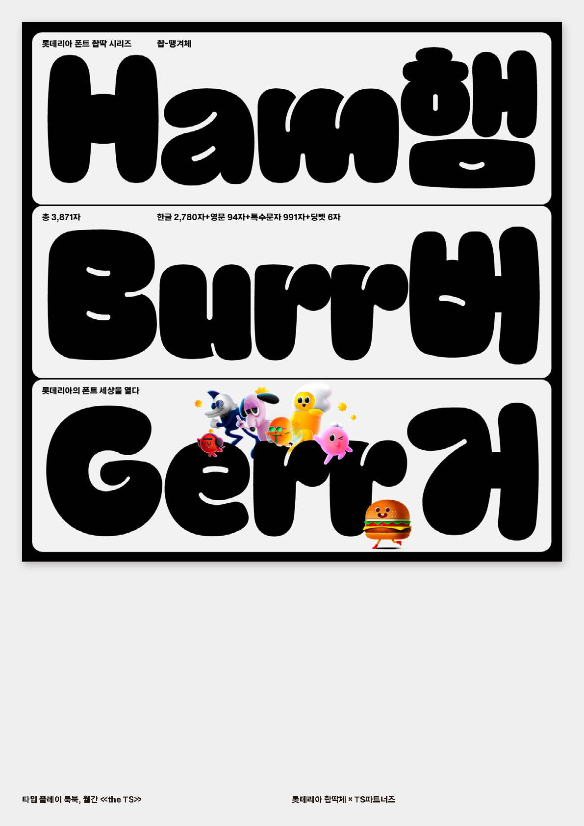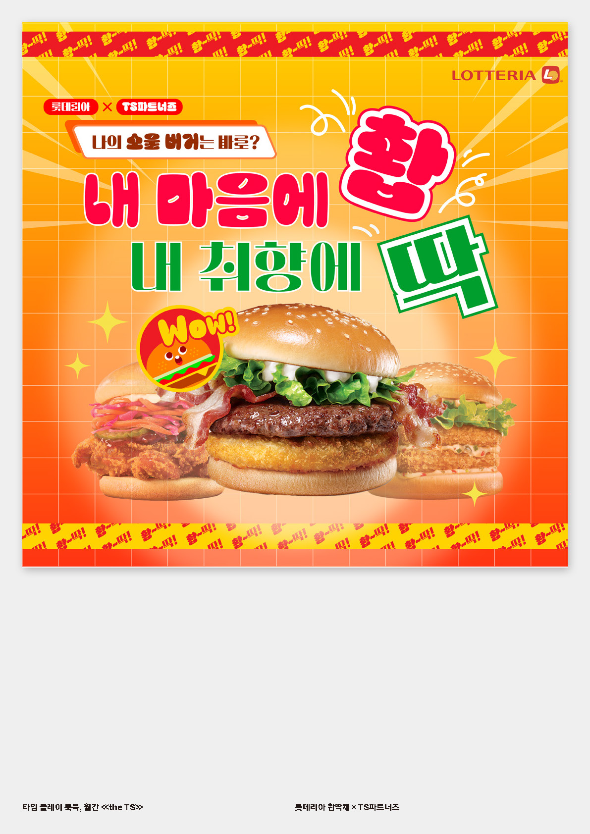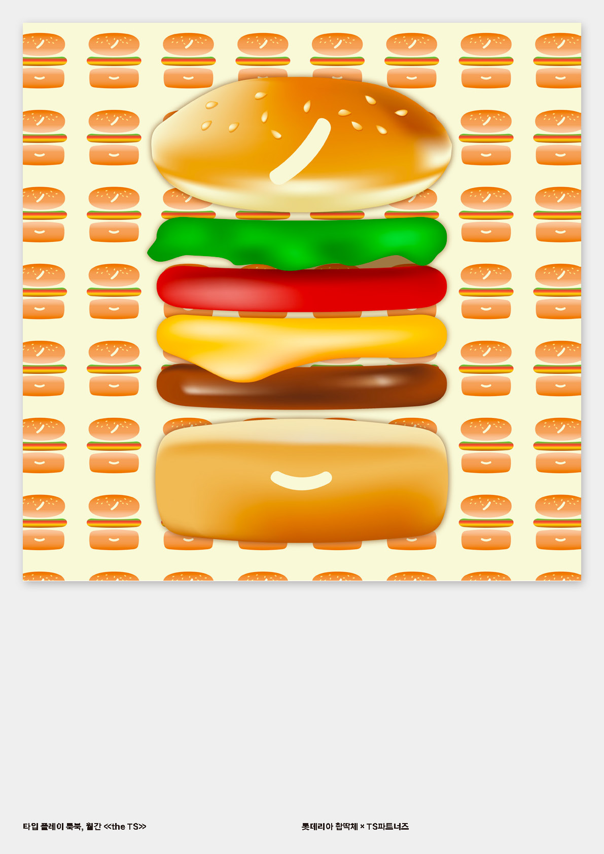 월간 《the TS》 2023년 3월호는 「촵딱체」 2종을 활용한 타이포그래피 작업물 모음입니다. 서체를 개발한 엉뚱상상, 그리고 TS 파트너즈(온라인 디자인 매체 『타이포그래피 서울』의 2030 크리에이터 그룹)가 디자인을 진행했습니다. TS 파트너즈 작업물의 경우, 2월 한 달간 일종의 공모전 형식으로 응모작들을 받아 그중 우수작 스무 편을 이번 월간 《the TS》에 수록했어요. 롯데리아 브랜드를 운영하는 롯데GRS 측에서 직접 우수작을 선정했습니다.