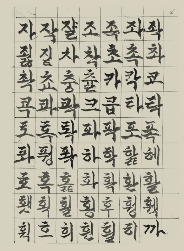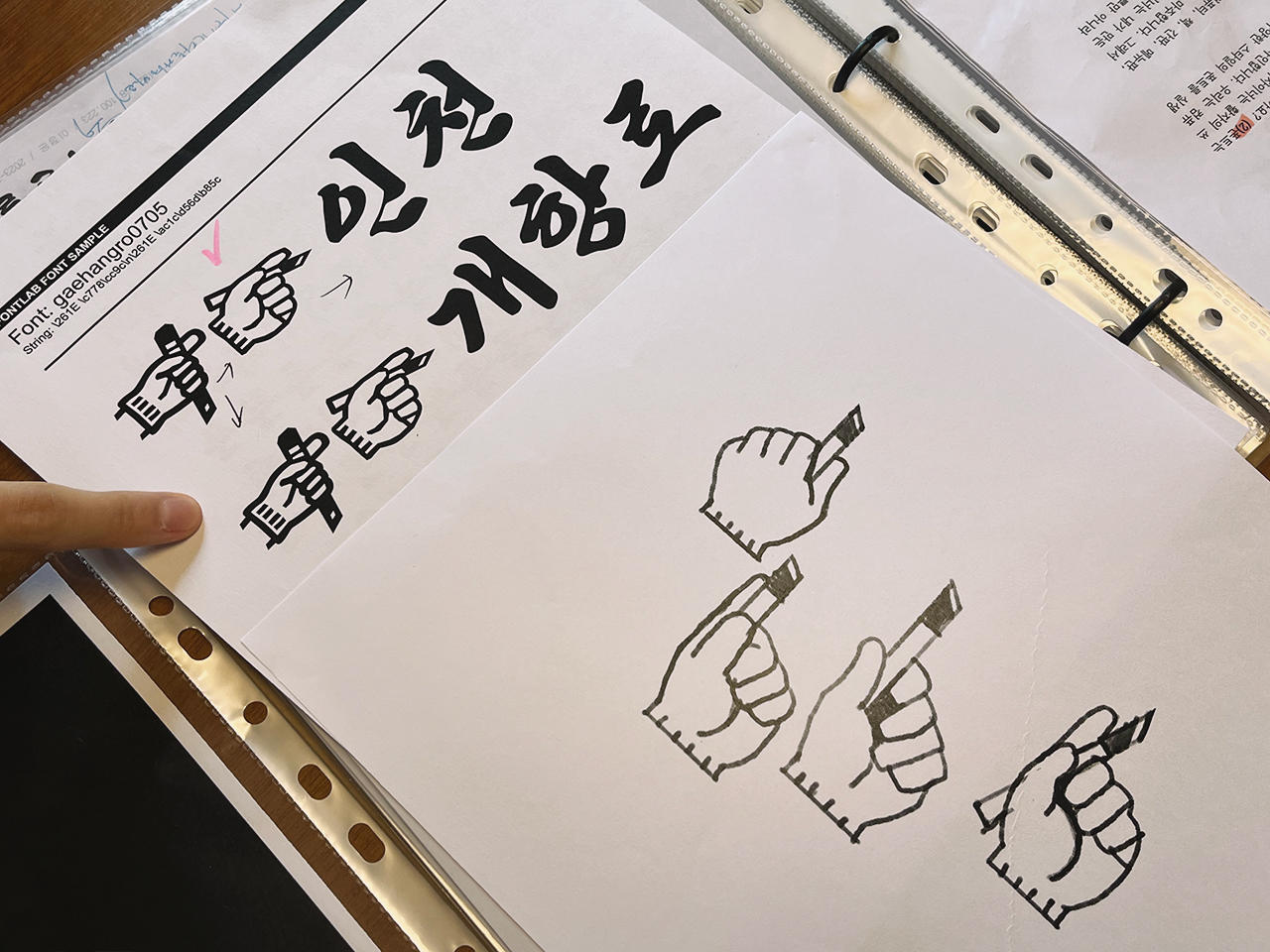 찬솔 전종원 사장님께 약간 빙의해서 사장님께서는 이렇게 글씨를 쓰시고 목간판에 옮겨 깎으셨겠구나 상상을 하는 거야. 계속 획을 살펴보고 또 쪼개고 어떻게 흐름을 가져가겠다는 것을 분석하고 상상하면서 글씨를 써갔어. 그래서 없는 글자꼴, 예를 들어 ‘박’은 있는데 ‘악’은 없다면 이응꼴은 다른 글자를 보면서 이런 흐름으로 갔겠다고 생각해서 쓰는 식으로 작업을 했던 거지. 없는 글자들이 많았는데, 일단 섞임모임꼴이 민글자 ‘화’ 하나밖에 없어서 섞임모임꼴은 거의 다 상상해서 그렸어.