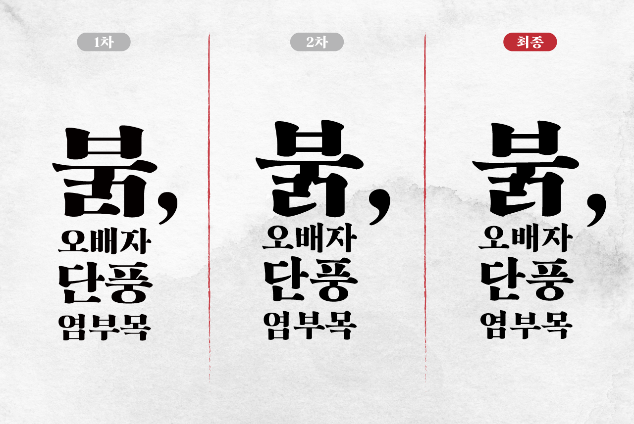 우빈: 글자를 처음 만들었을 때 의욕이 넘치다 보니 색다른 형태의 글자를 고민하다 에도 문자를 찾게 되었고, 그래픽적인 부분이 강조되는 서체라 작업하면서 재밌었어. 처음 서체를 특이한 형태를 하다 보니 두 번째 서체는 좀 더 스탠다드한 걸 해보자고 생각했는데, 아무래도 취향이 강한 편이라 그런지 목린도 색이 진한 글자가 됐어.
