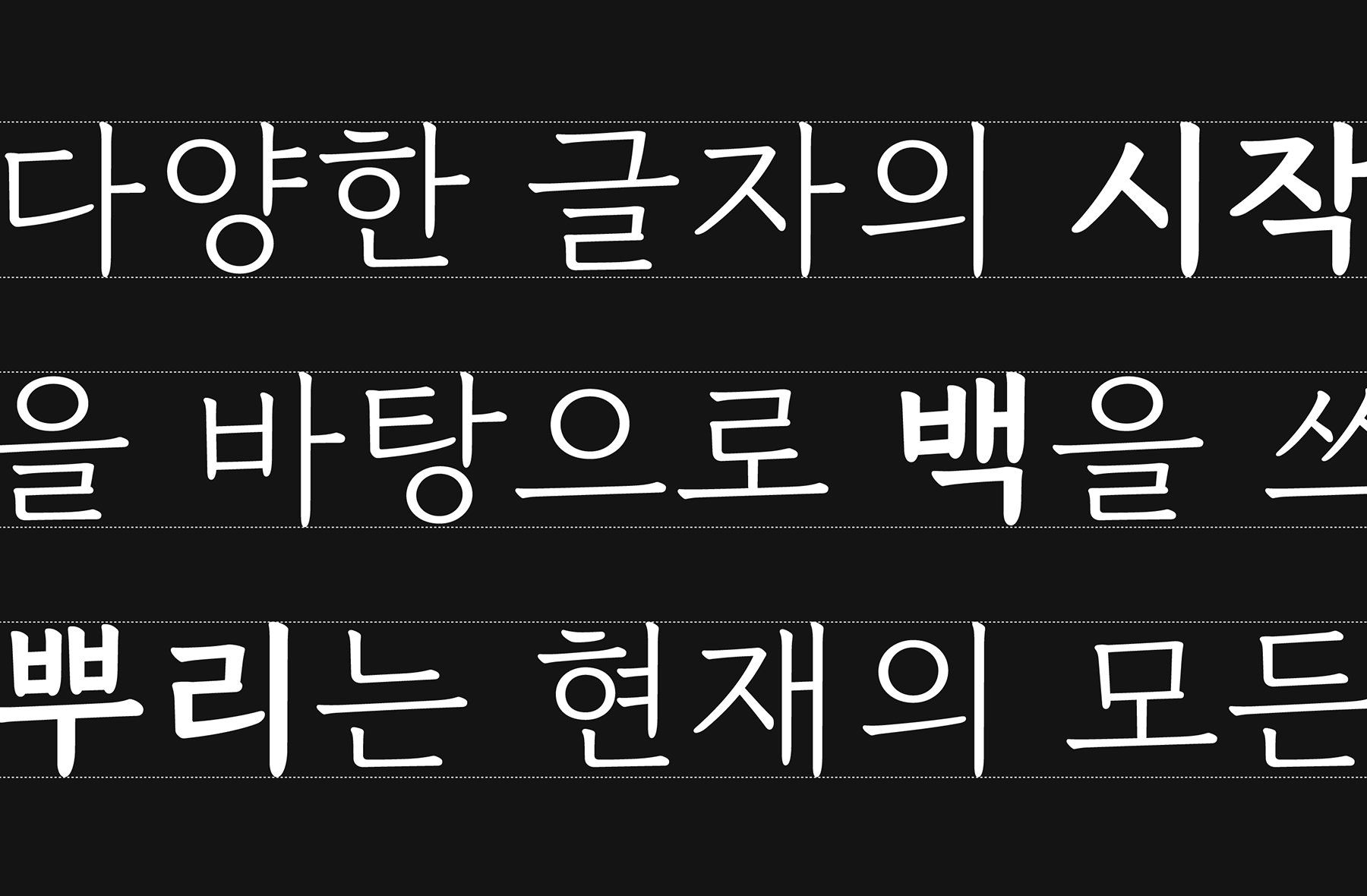 획의 굵기 대비를 정밀하게 조정하여 시각적 안정감과 가독성을 높이고, 곡선의 유연함과 직선의 날카로움을 조화롭게 담아냈습니다. 이러한 섬세한 설계 덕분에 인쇄 환경뿐만 아니라 디지털 환경 모두에서 일관되고 편안한 시각 경험을 선사합니다. 장문의 본문에서도 피로감 없이 읽힐 수 있는 고품질 텍스트 환경을 구현하여, 본문용 서체로서의 높은 완성도를 입증했습니다.