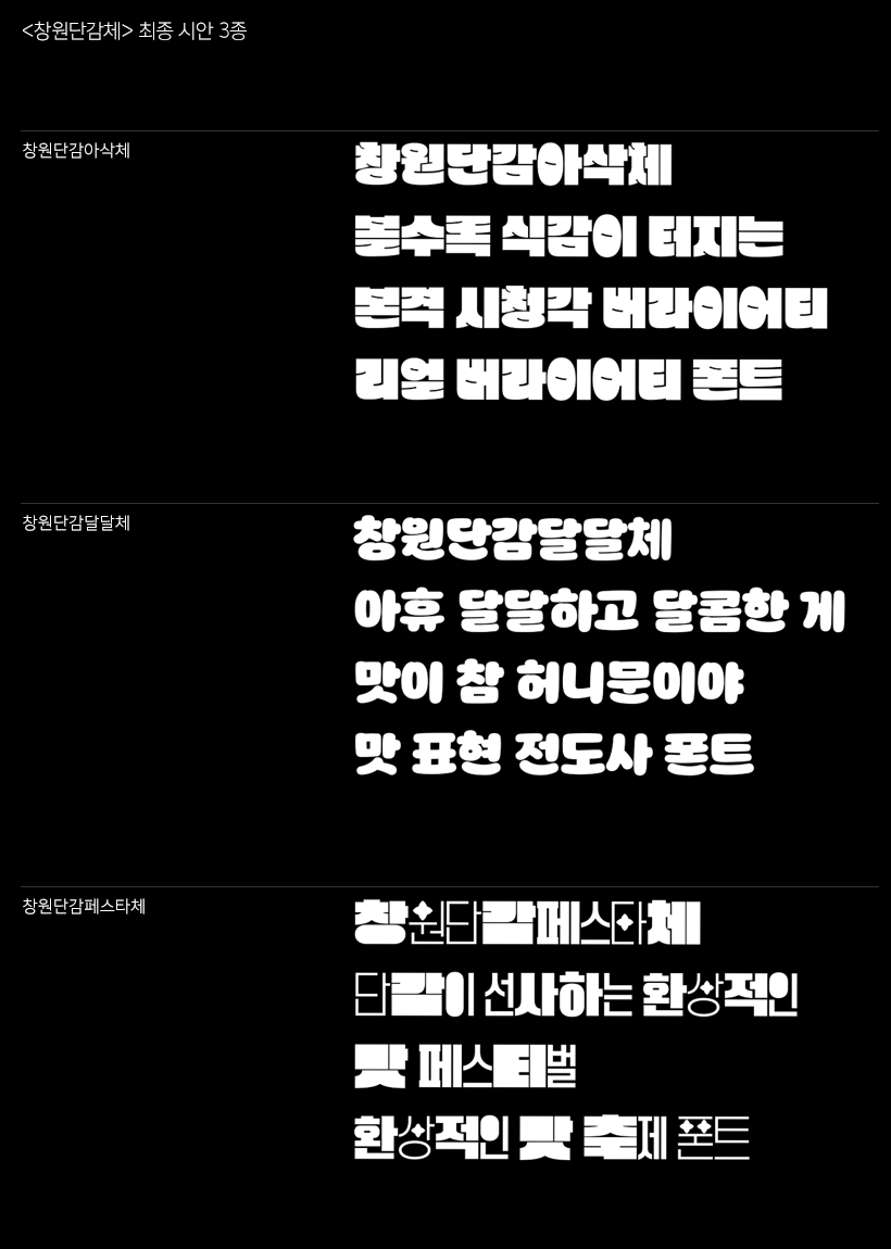 이러한 과정을 통해 <창원단감체> 최종 시안 3종을 완성했습니다. 어떠세요? 단감의 아삭함과 달콤함이 느껴지고, 당장이라도 창원단감축제를 즐기러 떠나고 싶어지지 않으신가요?