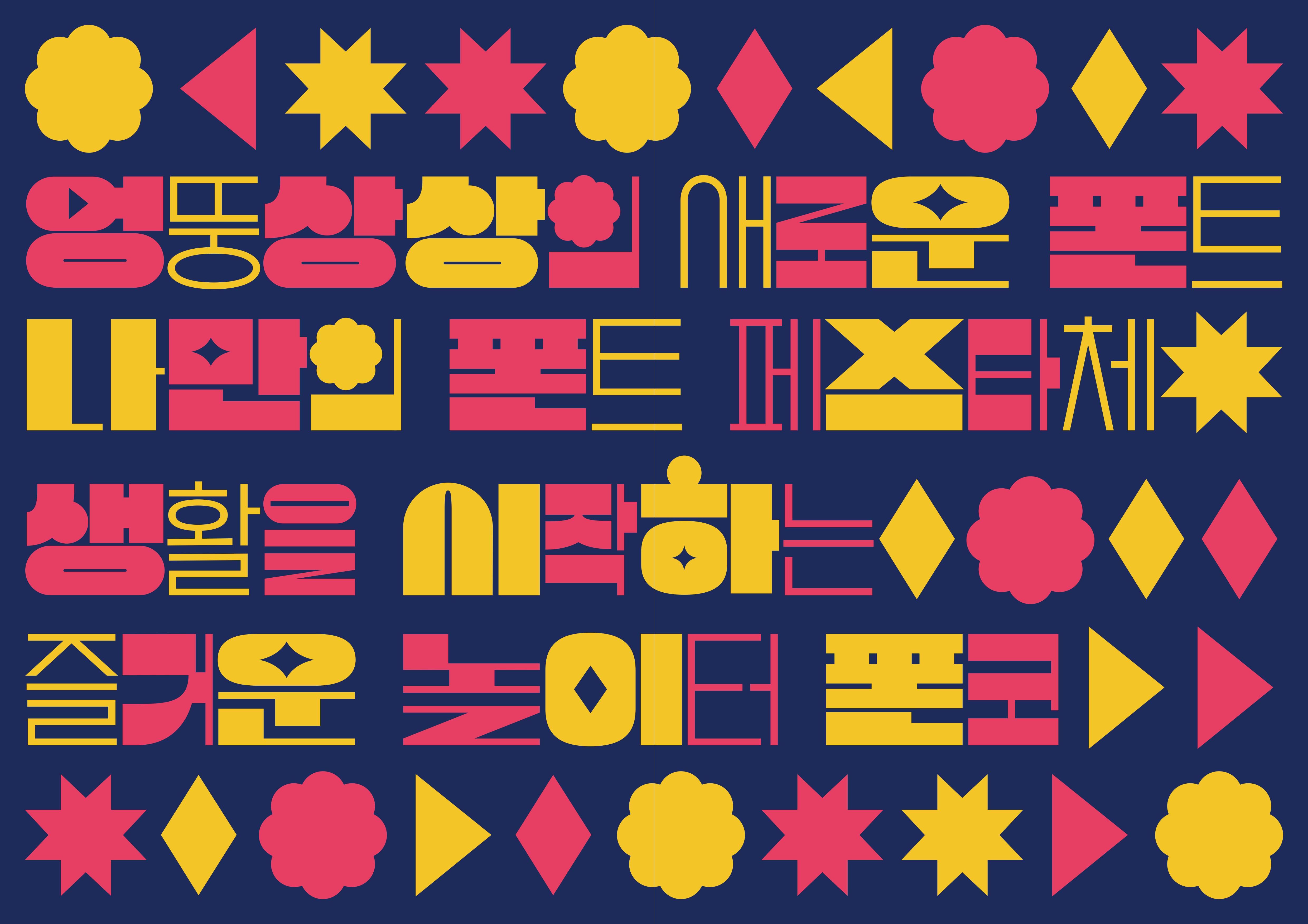 읽는 폰트(font to read)가 아닌 부르는 폰트(font to sing). 폰트의 역할을 바꾸면 폰트를 즐기는 방법도 바뀝니다. 지금도 엉뚱상상은 폰트의 장르 전환을 연구 중이에요. 그 결과물 중 하나인 ‘페스타체(가제)_variable’은 오는 7월 정식 론칭됩니다. ➲ 살짝 맛보기