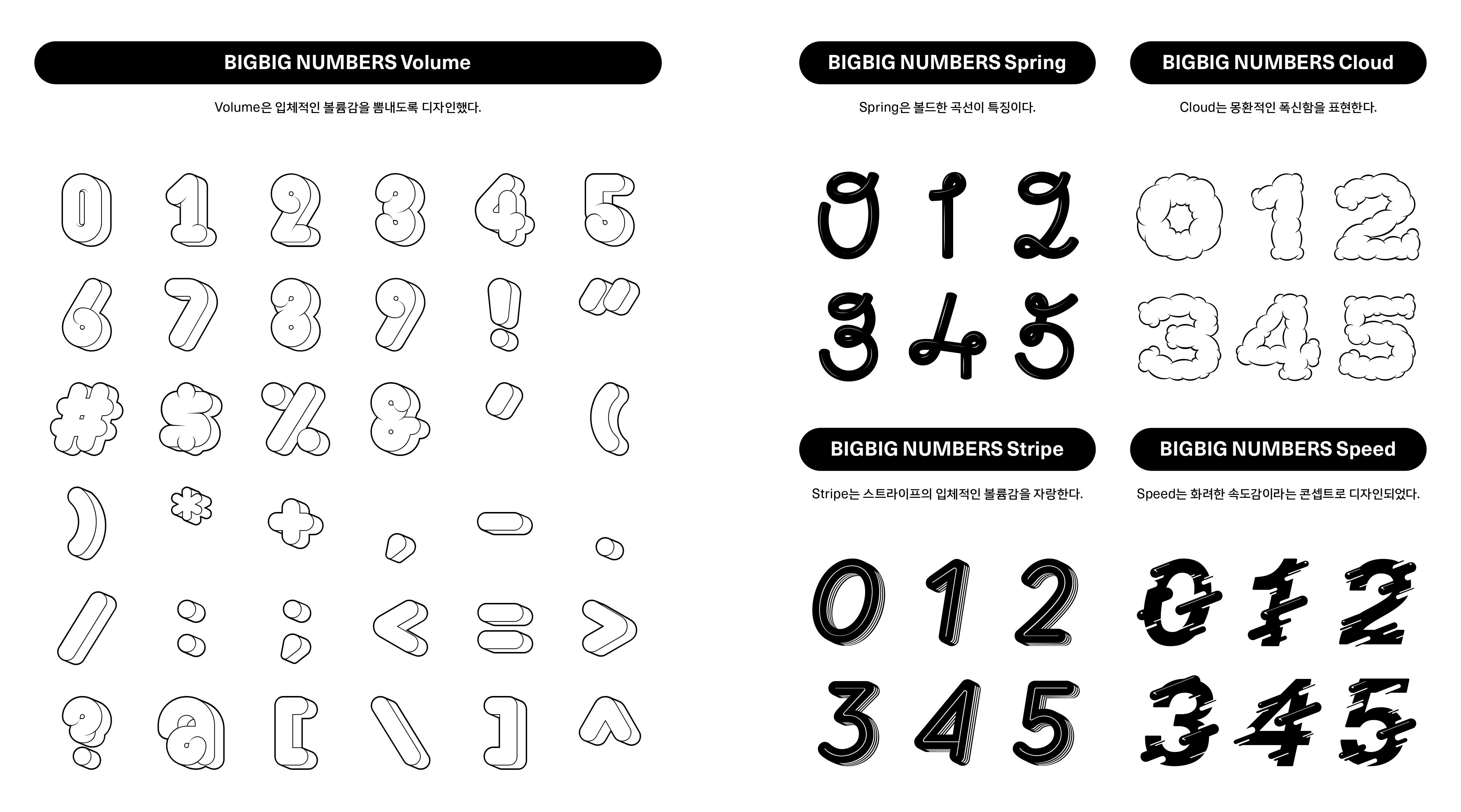 designer’s note ― “언제나 수학은 어렵습니다. 뭔가, 그 숫자들이 다가올 때의 공포감(?). 맞습니다. 전 ‘수포자’ 출신입니다. 저에게 있어 수학의 근본, ‘숫자’가 반갑게 다가온 적은 유년 시절 신체검사일에 아주 짧게 스쳐가는 색맹 검사지였습니다. ‘산수 교과서에 있던 숫자만이라도 말랑말랑했으면, 난 수포자가 되지 않았을지도 몰라!’라는 생각에서 시작한 프로젝트, 바로 빅빅 넘버스입니다. 숫자를 크게 프린트해서 여기저기 붙여보세요. 파티에도, 세일 안내판에도, 그리고 운동복 백넘버로도 쓸 수 있습니다.”
