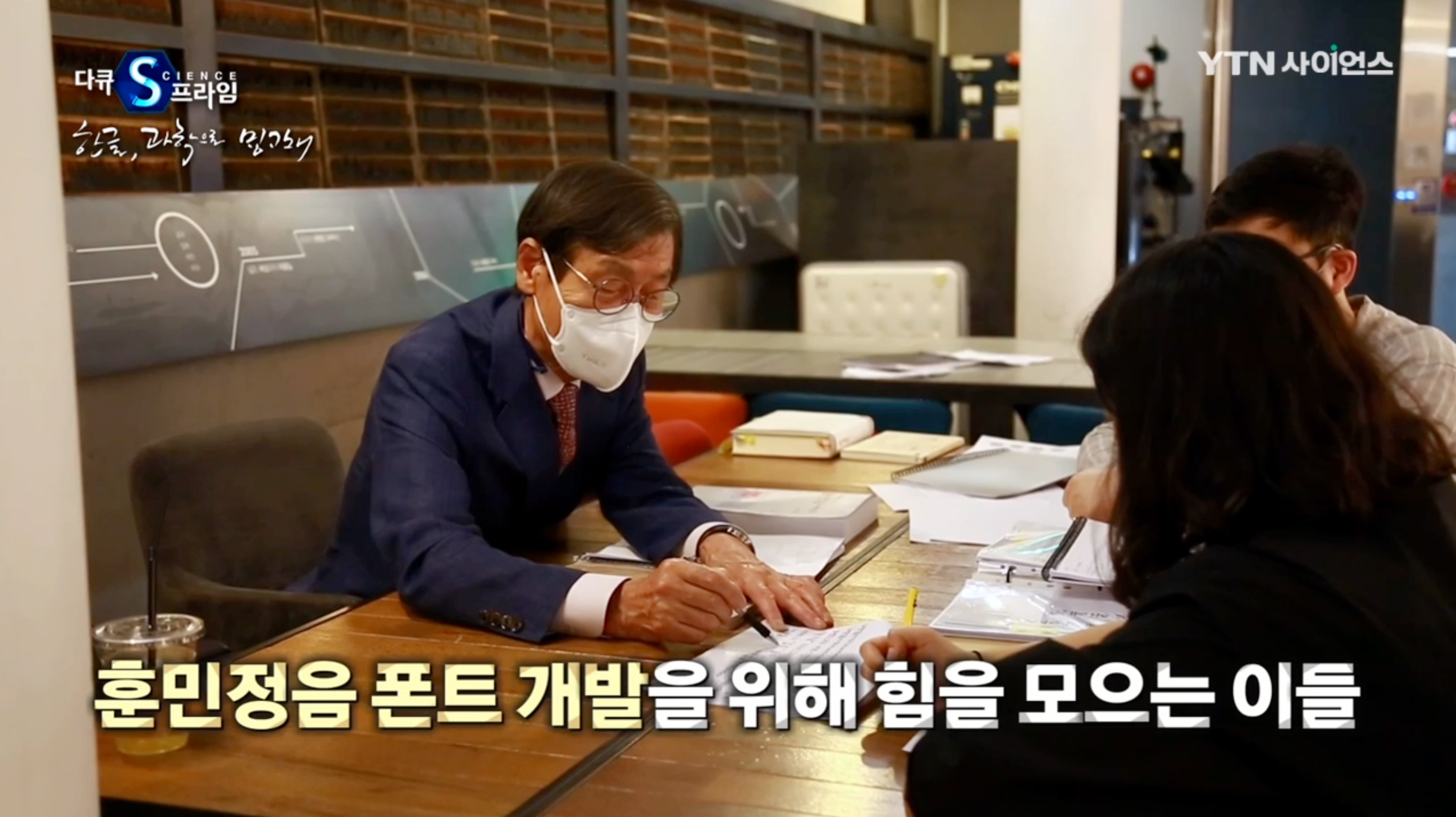 〈다큐 프라임 ― 한글, 과학으로 맹가노니〉는 여러 한글 연구가들과 인터뷰를 진행했는데요. 윤디자인그룹 ‘훈민정음 폰트’ 프로젝트 자문가이기도 한 서체 연구가 박병천 교수(경인교육대학교 미술교육과)도 그중 한 분입니다. 박병천 교수의 인터뷰는 그야말로 ‘온고지신’이라는 사자성어를 떠올리게 합니다. 또한, ‘훈민정음 폰트’ 프로젝트를 담당하고 있는 윤디자인그룹 정유권 디자이너(차장)의 인터뷰도 인상적인데요. 세대도 전문 분야도 다르지만, ‘한글’이라는 공통 영역을 지닌 두 인물의 이야기에 저절로 귀를 기울이게 됩니다.