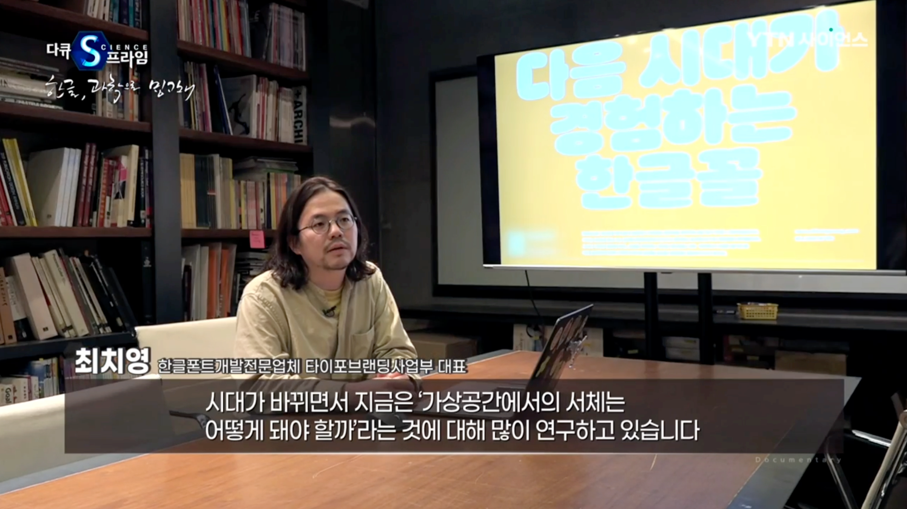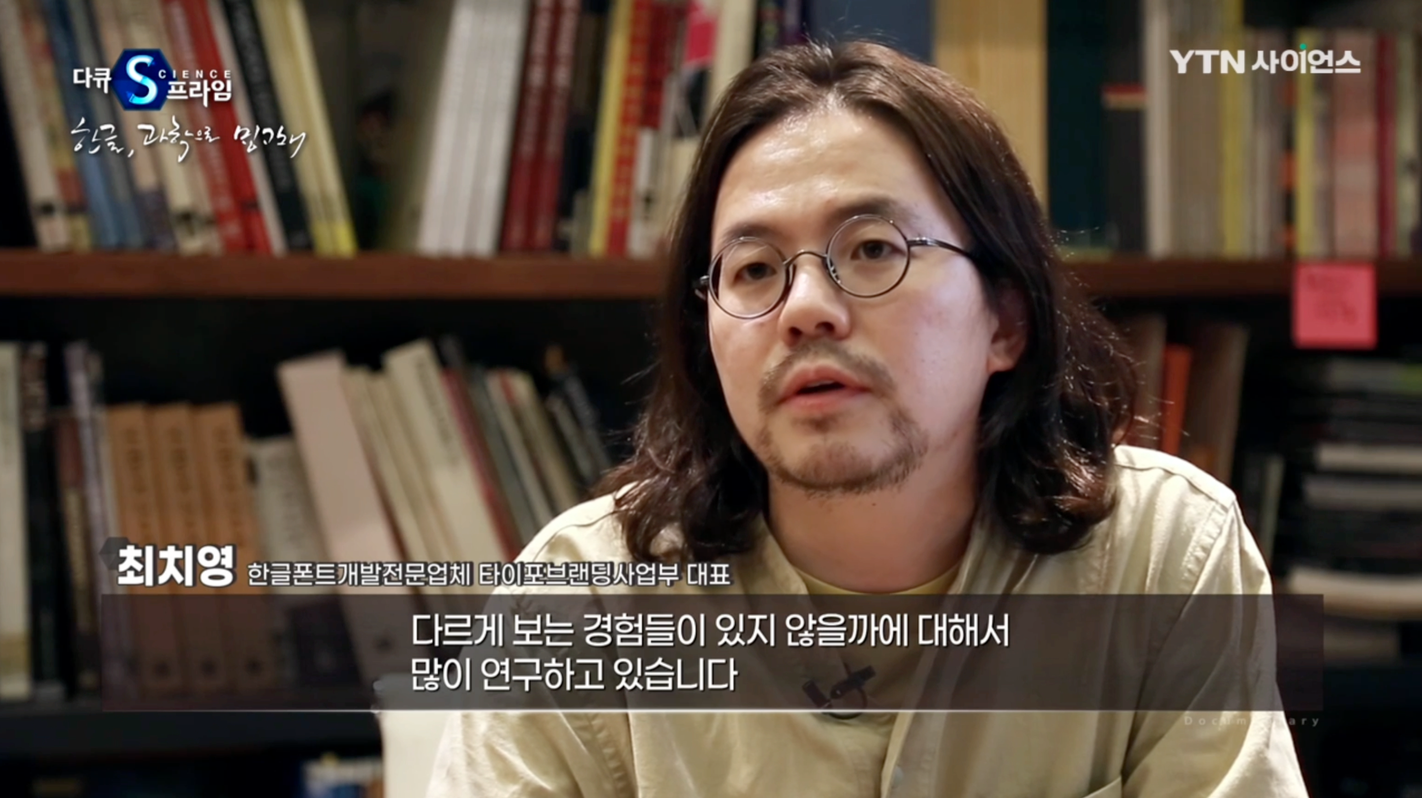 과학 전문 채널 ‘YTN 사이언스’의 프로그램 〈다큐 프라임〉에 윤디자인그룹(회장 편석훈)이 출연했습니다. 제575돌 한글날(2021년 10월 9일)을 기념한 방송 〈다큐 프라임 ― 한글, 과학으로 맹가노니〉 편에 ‘한글 폰트 개발 전문 업체’로 소개된 것이죠.