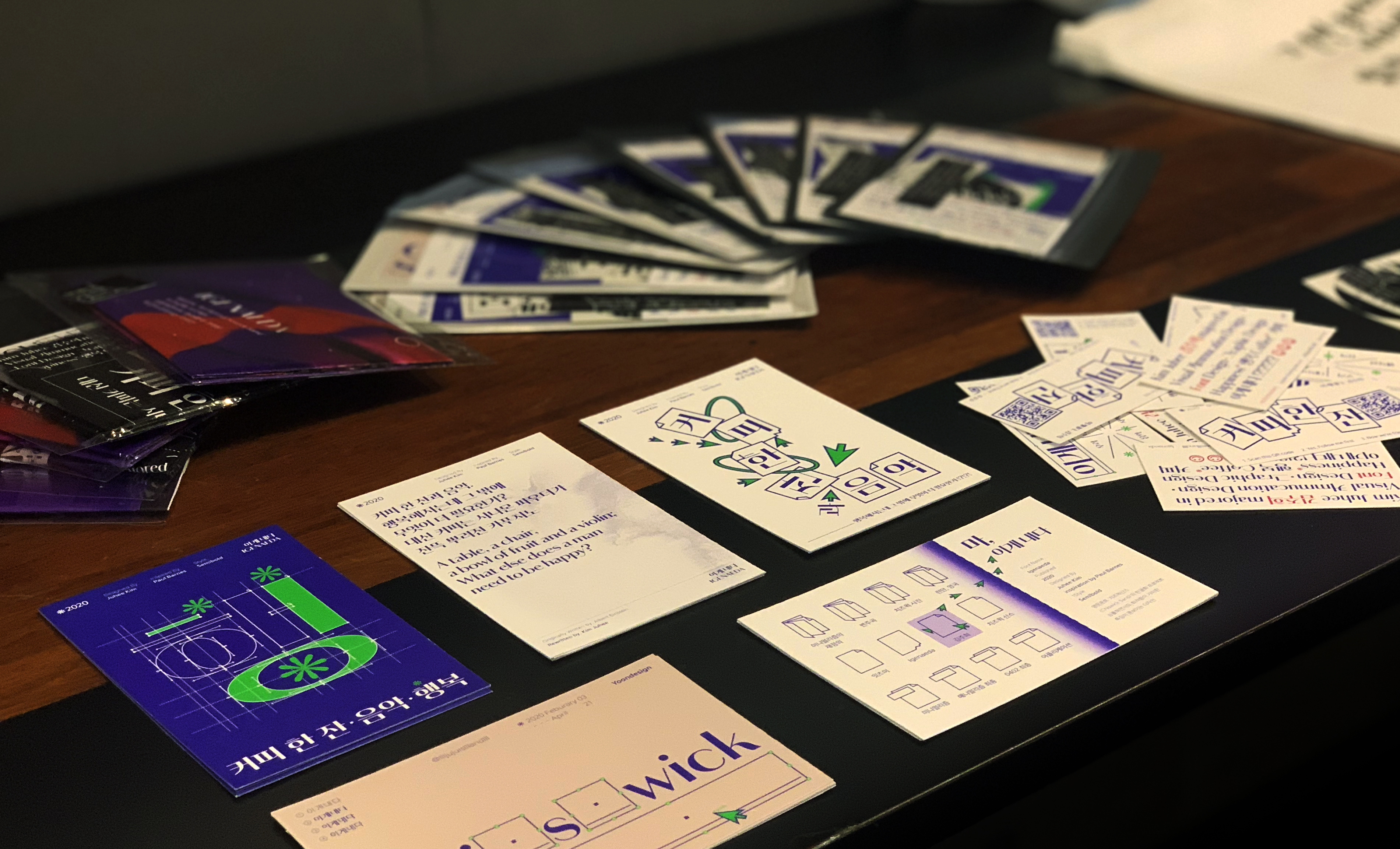학생 시절 ‘한울’ 활동을 할 때 소규모 팀 프로젝트에 참여한 적이 있는데요. [Hangul.zip]이라는 이름이었습니다. 한글의 조형성을 이용한 인터랙션 캠페인이었어요. 예를 들어 ‘돌돔’을 ‘뚊’이라고 표현한다거나, ‘부부’를 ‘쀼’로 표현한 압축된 글자들을 아트워크 형식으로 디자인하고, 그것들을 모아 전단지 형식의 포스터를 만들어 교내에 붙여 소통했었죠. 한글이 한 글자마다 덩어리를 이룰 수 있다는 점, 초성·중성·종성이 합해져 한 음절이 되는 점, 또 그를 통해 두 글자 이상의 단어를 한 덩어리로 압축시킬 수 있다는 점을 활용해서 스토리를 꾸몄습니다. 그런 종류의 글자들을 찾다 보니 ‘뀰’(꿀처럼 단 귤), ‘똴’(도달), ‘쬲’(존좋) 등 정말 재미있는 글자들이 많더라고요. 저는 이렇게 새롭고 낯선 대상에게 확 끌리는 성향을 가진 사람인 것 같습니다.(웃음)