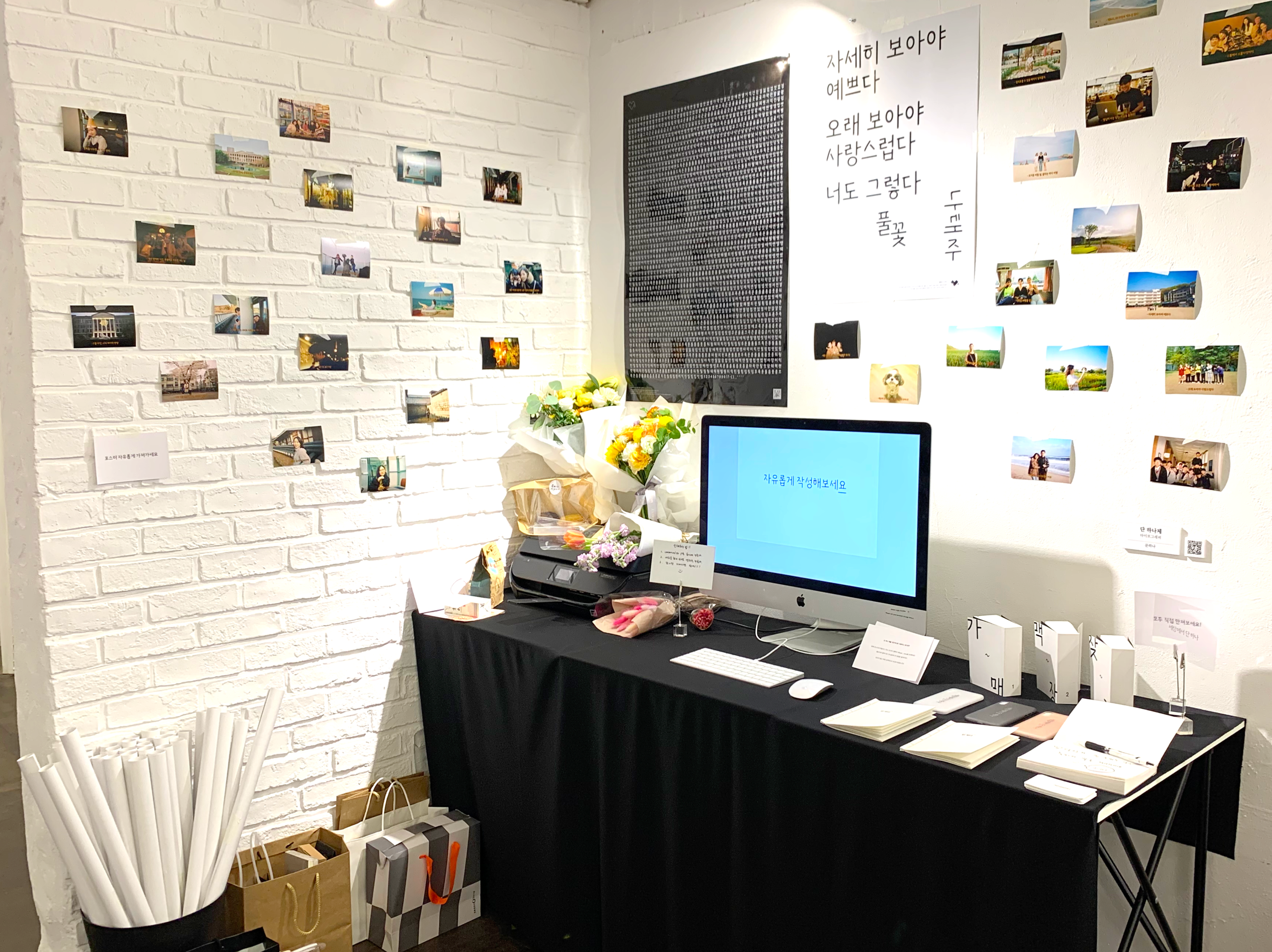 사범대생 티를 조금만 더 내볼까요?(웃음) 교생 실습 얘기를 잠깐 해보겠습니다. 당시 저는 학과 수업이랑 독학으로 제법 열심히 디자인을 공부하고 있었거든요. 그런 학구열을 교생 실습 때도 반영해봤습니다. 제가 교습을 나간 학교의 학생들에게 타이포그래피를 가르쳤어요. 수업 이름이 ‘한 글자에 의미 담기’였습니다. 디자인에는 기획이 꼭 들어가야 한다는 점, 글자는 누군가의 디자인이라는 점, 이 두 가지가 수업의 핵심이었어요. 그리고 아이들의 생각을 좀더 확장시켜주고 싶어서 실기 과제도 함께했습니다. ‘똥’, ‘삶’, ‘죄’ 같은 한 글자 낱말을 제시하고, 학생들에게 각자 느낌을 담아서 저마다 새로운 ‘똥’, ‘삶’, ‘죄’를 써보도록 했죠. 그러고 나서 아이들의 글자 스타일을 모두 이어서 레터링으로 만드는 작업을 했습니다. 그때 제 수업을 들었던 아이들이 ‘문하나 교생 선생님’을 오래도록 기억해주었으면 좋겠네요.(웃음)