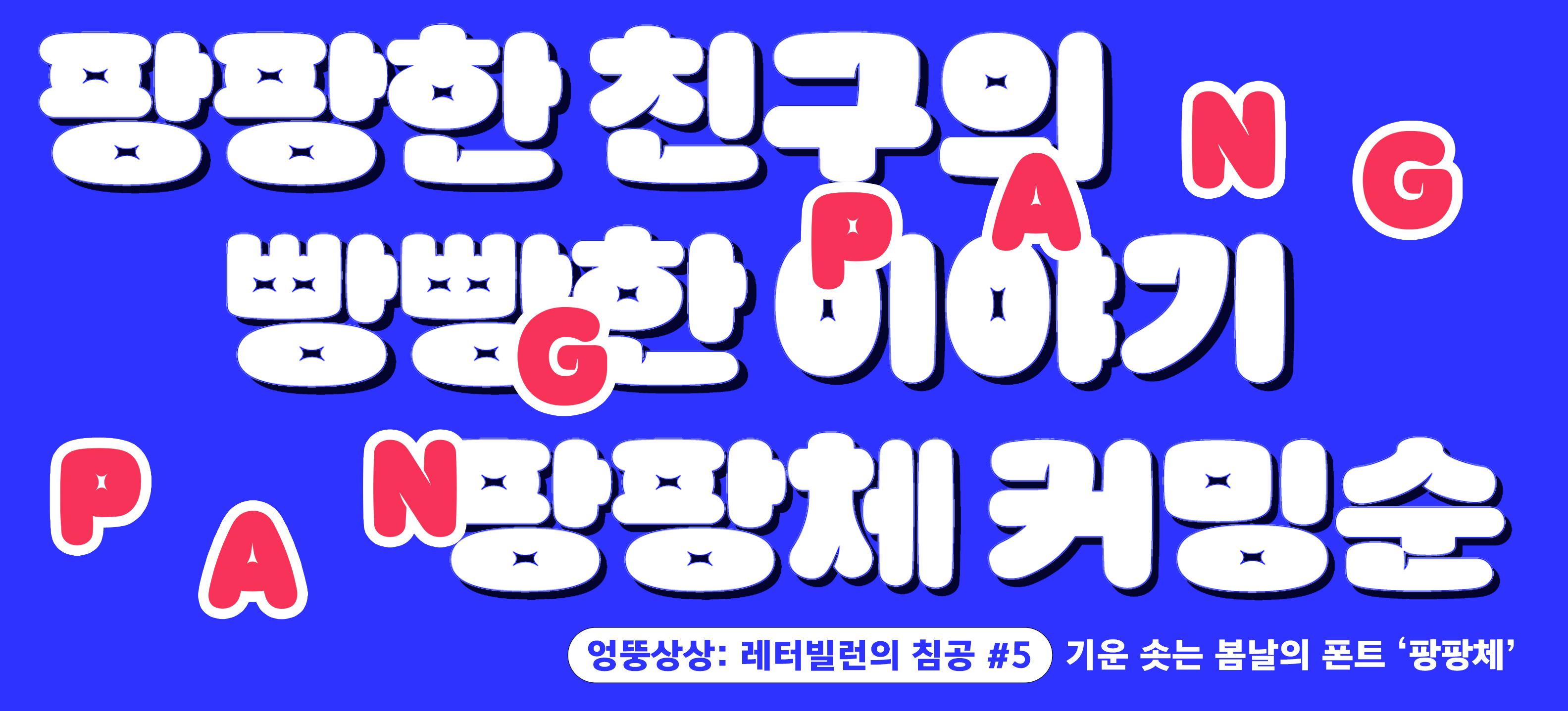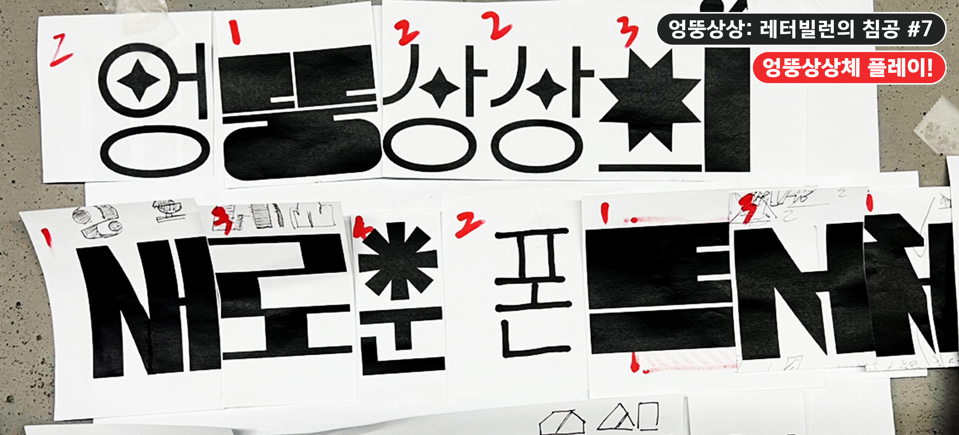 『타이포그래피 서울』(TS) 시리즈 [엉뚱상상: 레터빌런의 침공]은 타이포 브랜딩 스튜디오 엉뚱상상의 폰트 디자인 팀 ‘레터빌런’ 디자이너들의 글자-생각과 글자-작업을 기록해 나가는 연재물입니다. 레터빌런 팀은 이름처럼 히어로가 아니라 빌런을 자처하는데요. 글자 디자이너의 머릿속에 표준 또는 규범으로 잠재된 관념들을 극복하겠다는 의지 표명이죠.
