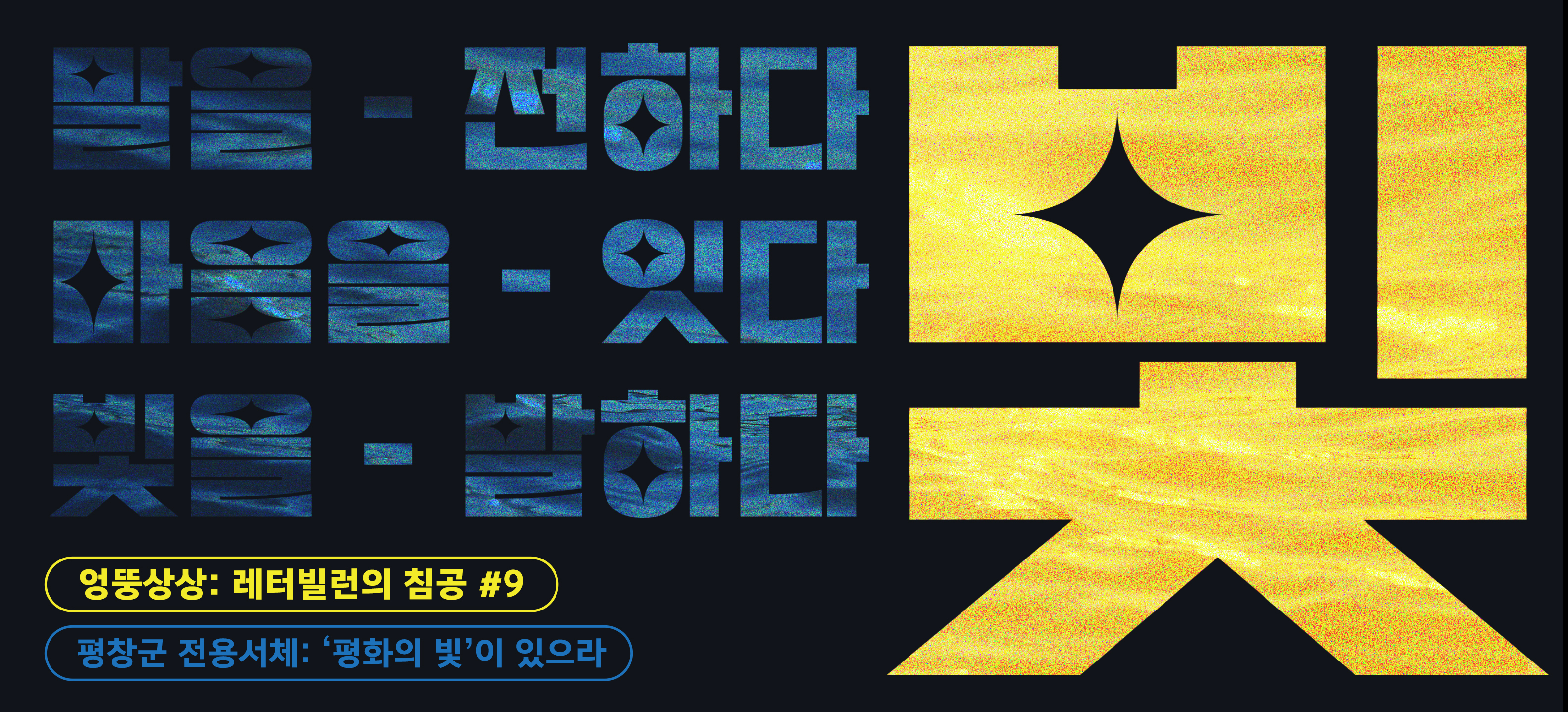 위 글처럼 엉뚱상상 레터빌런 팀은 이 시리즈의 키워드로 #엉뚱상상 #레터빌런 #침공을 꼽고 있습니다. 하지만 다른 낱말이 더 적절할 것 같아요. 위 글 마지막 문장에 언급된 #문화입니다. 표준과 규범에 저항(?)하는 안티 히어로이자 빌런 혹은 인베이더(invader)로서, 레터빌런이 궁극적으로 목적하는 바가 ‘폰트 문화’이기 때문이죠. 잘 읽히고 잘 쓰이면서도 심미성까지 갖춘 글자가 기존의 품질 기준이라면, 레터빌런은 이러한 기준에서 얼마간 벗어나 ‘사용되기 이전의 글자’, 즉 ‘글자 자체’의 인상과 존재로써 문화적 파동을 발생시키는 영역을 지향하고 있습니다.